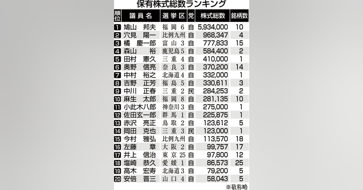 衆院議員の資産公開によると、株式を保有している議員は全体の3割に当たる157人で、株式数は計約1300万株だった。安倍政権の経済政策「アベノミクス」や円安などによる株高傾向から評価額が増えた議員も多いとみられるが、「売る気はないので関係ない」との声も聞かれた。保有数が最も多いのは鳩山邦夫元総務相=福岡6区=で、母方の祖...